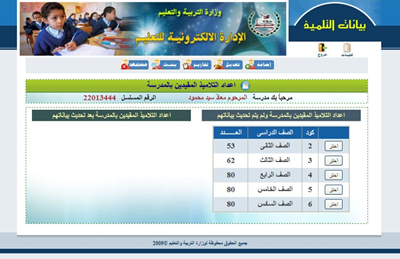 قاعدة بيانات التلاميذ وتشمل البيانات الأساسية لكل تلميذ ، كما ان نتائج امتحانات النقل يتم استخدامها في نقل التلاميذ من صف دراسي إلى صف دراسي أخر .