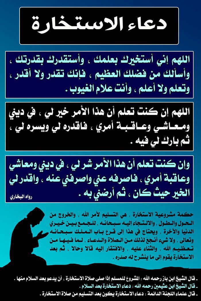 يدعى المسلم ويقول “اللهم إني أستخيرك بعلمك وأستقدرك بقدرتك وأسألك من فضلك العظيم فإنك تقدر ولا أقدر وتعلم ولا أعلم وأنت علام الغيوب اللهم أن كنت تعلم أن هذا الأمر (ويطلب حاجته) خير لي في ديني ومعاشي وعاقبة أمري فاقدره لي ويسره لي ثم بارك لي فيه وإن كنت تعلم أن هذا الأمر شر لي في ديني ومعاشي وعاقبة أمرى فاصرفه عني واصرفني عنه واقدر لى الخير حيث كان ثم أرضني به”.