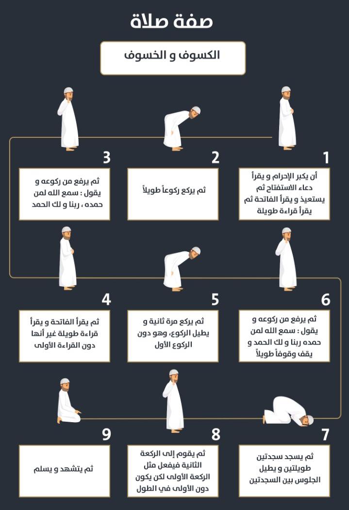 وعن حديث كيفية الصلاة وقت الخسوف فقد روت عائشة رضى الله عنها خَسَفَتِ الشَّمْسُ فِي عَهْدِ رَسُولِ اللهِ فَصَلَّى رَسُولُ اللهِ بِالنَّاسِ، فَقَامَ فَأَطَالَ الْقِيَامَ، ثُمَّ رَكَعَ فَأَطَالَ الرُّكُوعَ، ثُمَّ قَامَ فَأَطَالَ الْقِيَامَ وَهُوَ دُونَ الْقِيَامِ الْأَوَّلِ، ثُمَّ رَكَعَ فَأَطَالَ الرُّكُوعَ وَهُوَ دُونَ الرُّكُوع الأَوَّلِ، ثُمَّ سَجَدَ فَأَطَالَ السُّجُودَ، ثُمَّ فَعَلَ فِي الرَّكْعَةِ الثَّانِيَةِ مِثْلَ مَا فَعَلَ فِي الْأولَى، ثُمَّ انْصَرَفَ وَقَدِ انْجَلَتِ الشَّمْسُ، فَخَطَبَ النَّاسَ فَحَمِدَ الله وَأَثْنَى عَلَيْهِ، ثُمَّ قَالَ: إنَّ الشَّمْسَ وَالْقَمَرَ آيَتَانِ مِنْ آيَاتِ اللهِ لَا يَخْسِفَانِ لِمَوْتِ أَحَدٍ وَلَا لِحَيَاتِهِ، فَإِذَا رَأَيْتُمْ ذَلِكَ فَادْعُوا الله وَكَبِّرُوا وَصَلُّوا وَتَصَدَّقُوا رواه البخاري.